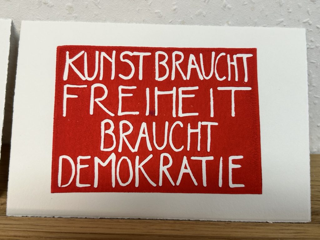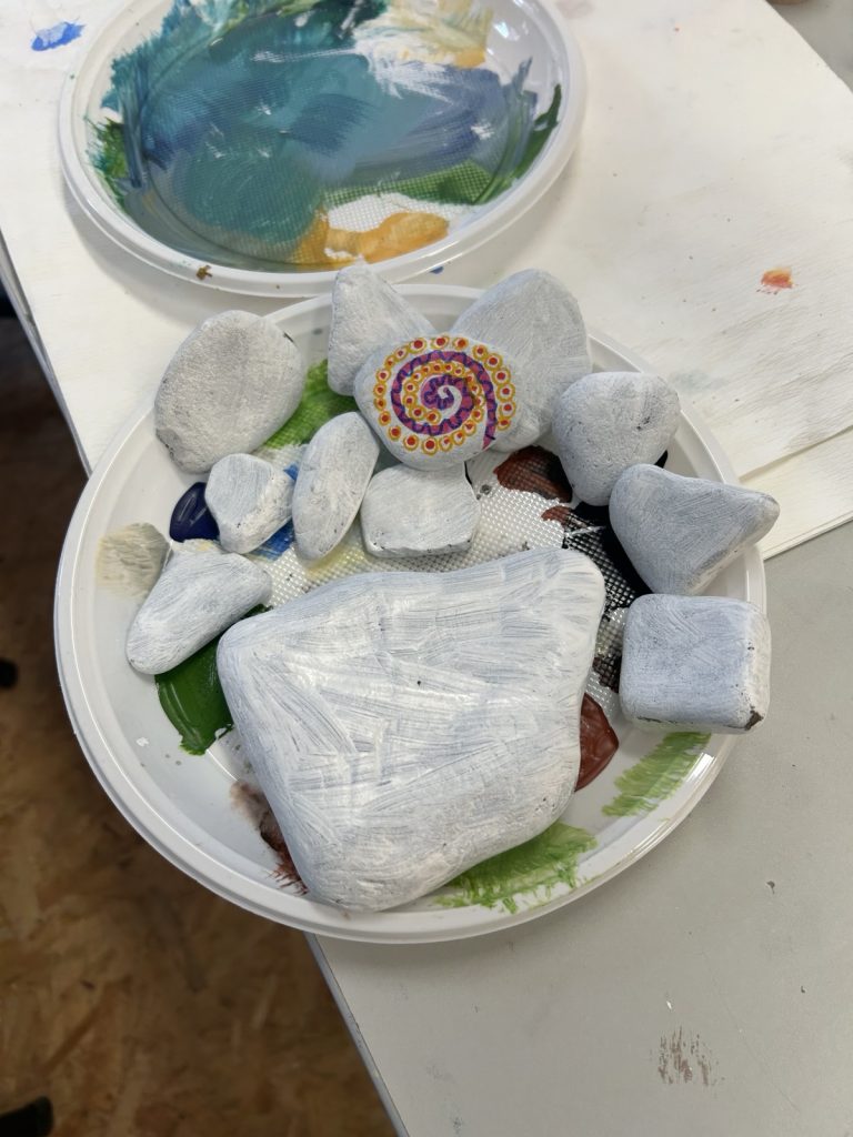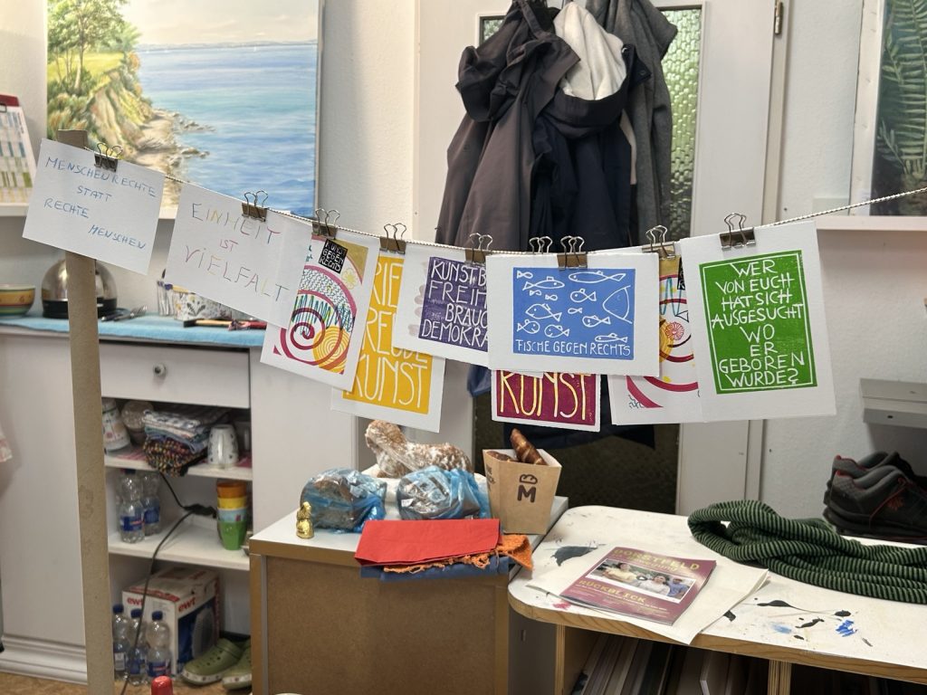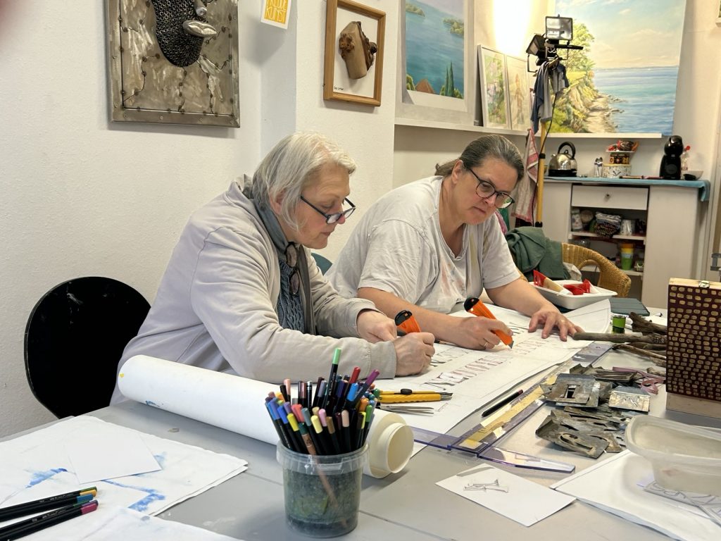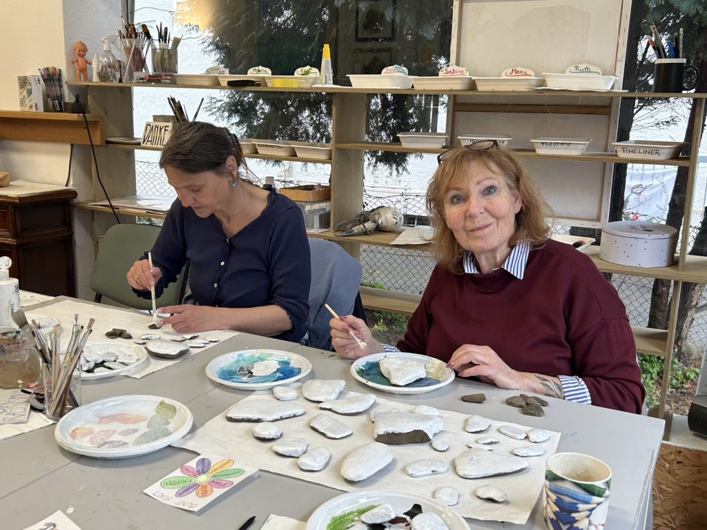 Zwei unserer Dortmund-West-OMAS trafen sich mit drei Wetteraner Künstlerinnen. In einer neuen Kooperation entwickelten wir gemeinsam neue Ideen für unsere nächsten Aktionen und bereiteten dafür die Materialien vor: Steine und Stöcke wurden zum Bemalen weiß grundiert, Vorlagen für Buttons und Karten entworfen, Schablonen hergestellt. Die Ergebnisse werden wir auf dem Wilhelmplatz am 24.4.2026 dabeihaben.
